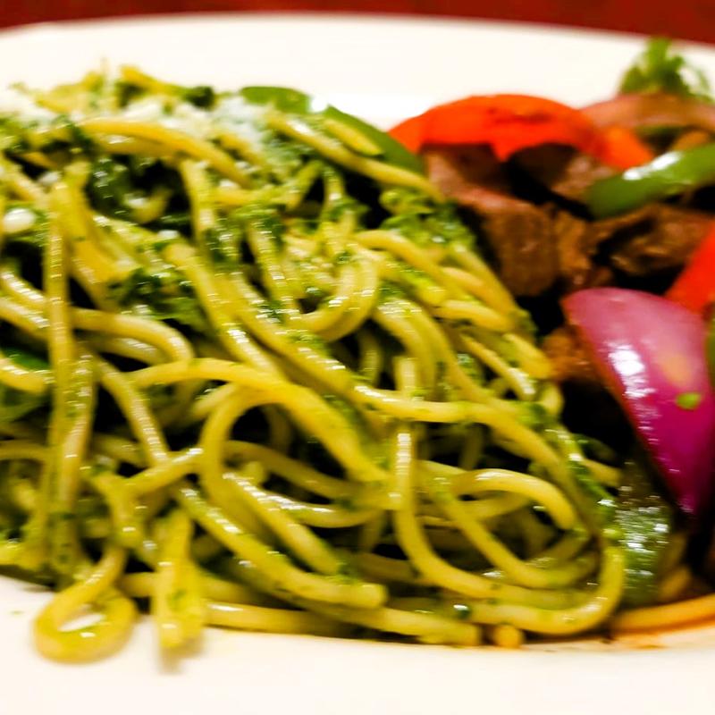 Tallarin Verde con Lomo Saltado