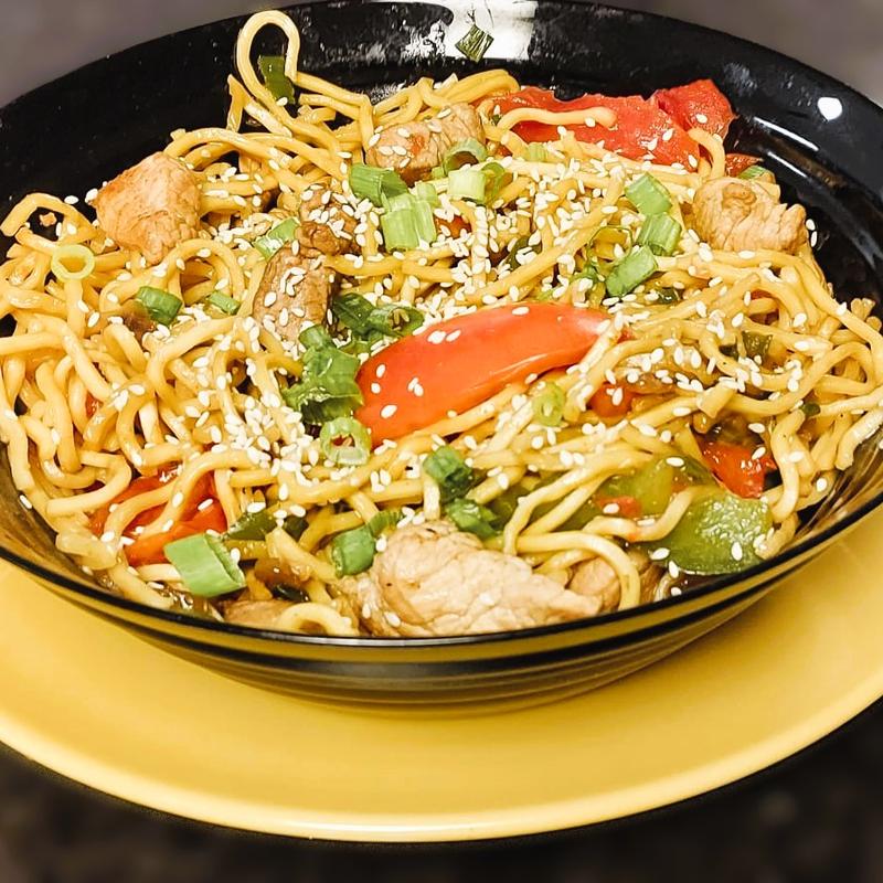 Pork Sirloin Tallarin Chaufa, accompanied by vegetables and our distinctive chaufa sauce.